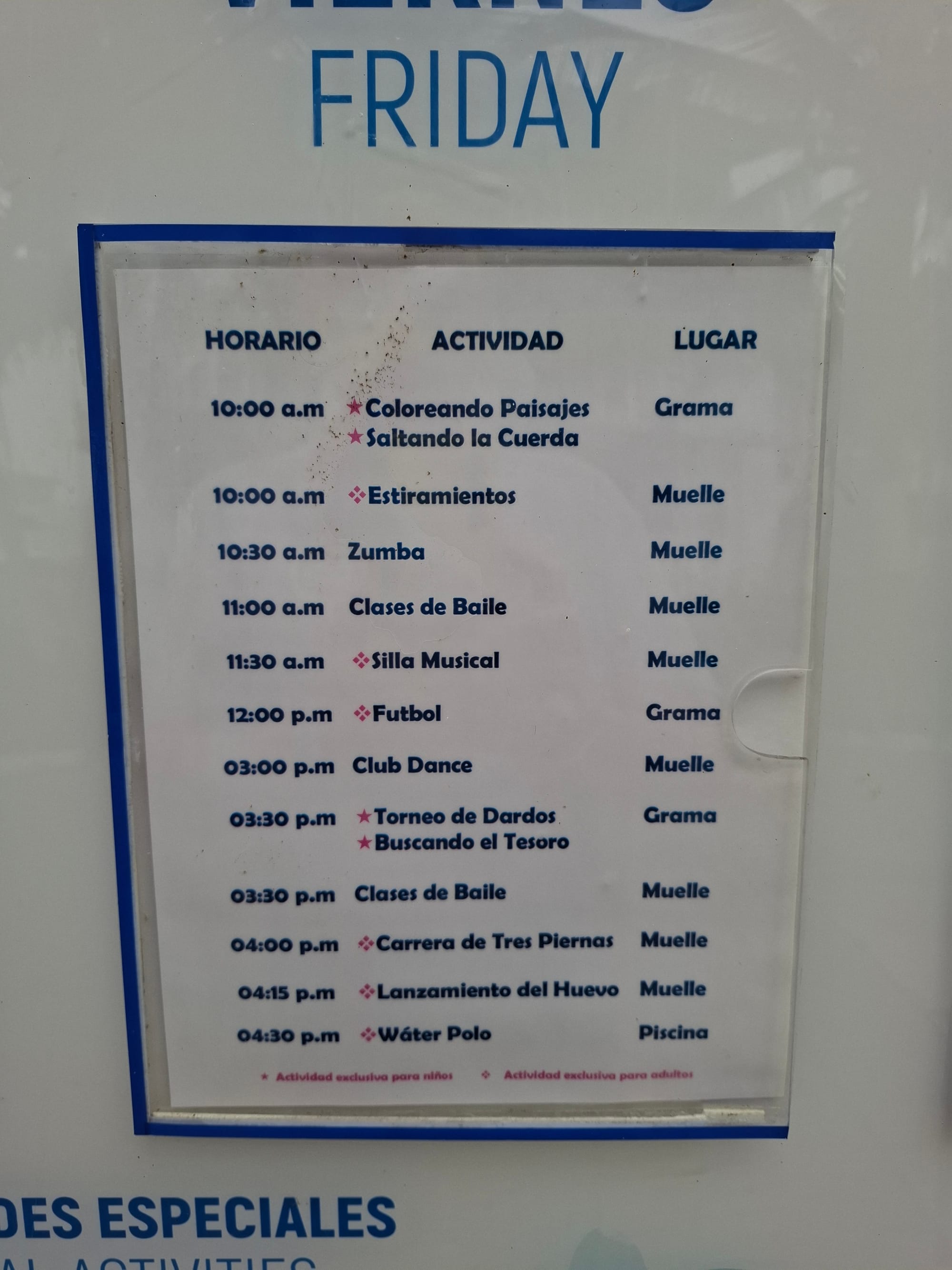 I’ve never been on a cruise—just not my thing. But this resort? It’s exactly how I imagine a cruise might feel. There’s a wall-sized activity schedule that looks like it was swiped from the Promenade Deck on the Loveboat. Stage entertainment every night, volleyball games that no one really joins, and organized “fun” that mostly exists on paper. I’m sure someone somewhere is doing aqua aerobics, but it’s easy to miss if you're not looking for it.